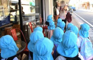 『うんどうかいがんばったねクッキング』はサンドイッチを作りました。まずはみんなで近所のパン屋さんへ。