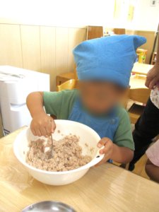 お昼寝から少し早く起きて、クッキングスタートです。ツナとマヨドレを1人ずつ混ぜました。