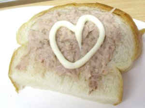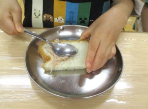 パンにイチゴジャムかツナマヨを塗って、みんなで「いただきます」