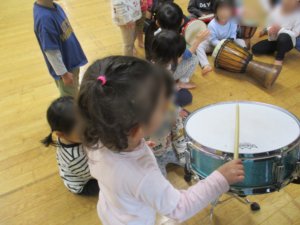 強く叩いたり違う音を探したり興味を持って集中して音に耳を傾けていました。
